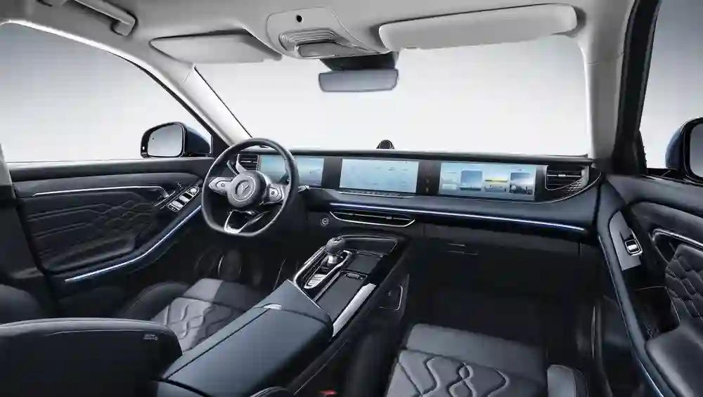 Салон Voyah Free, как и кузов, сделан без излишних нагромождений, призванных демонстрировать его премиальность. Традиционный центральный тоннель с джойстиком и рядом кнопок, удобный руль, приборная панель с тремя экранами. Есть и своя особенность: когда автомобиль выключен, весь блок приборной панели с мониторами и воздуховодами уезжает на несколько сантиметров вниз, как бы складываясь в недра приборной панели, а при включении зажигания выезжает обратно. Его можно выдвинуть и убрать также принудительно кнопкой на центральном тоннеле: в этом случае мониторы становятся чуть уже, но информация на них остается та же, но в виде минималистичных иконок. Производителем заявлена безотказная работа механизма на протяжении 30 тысяч циклов.