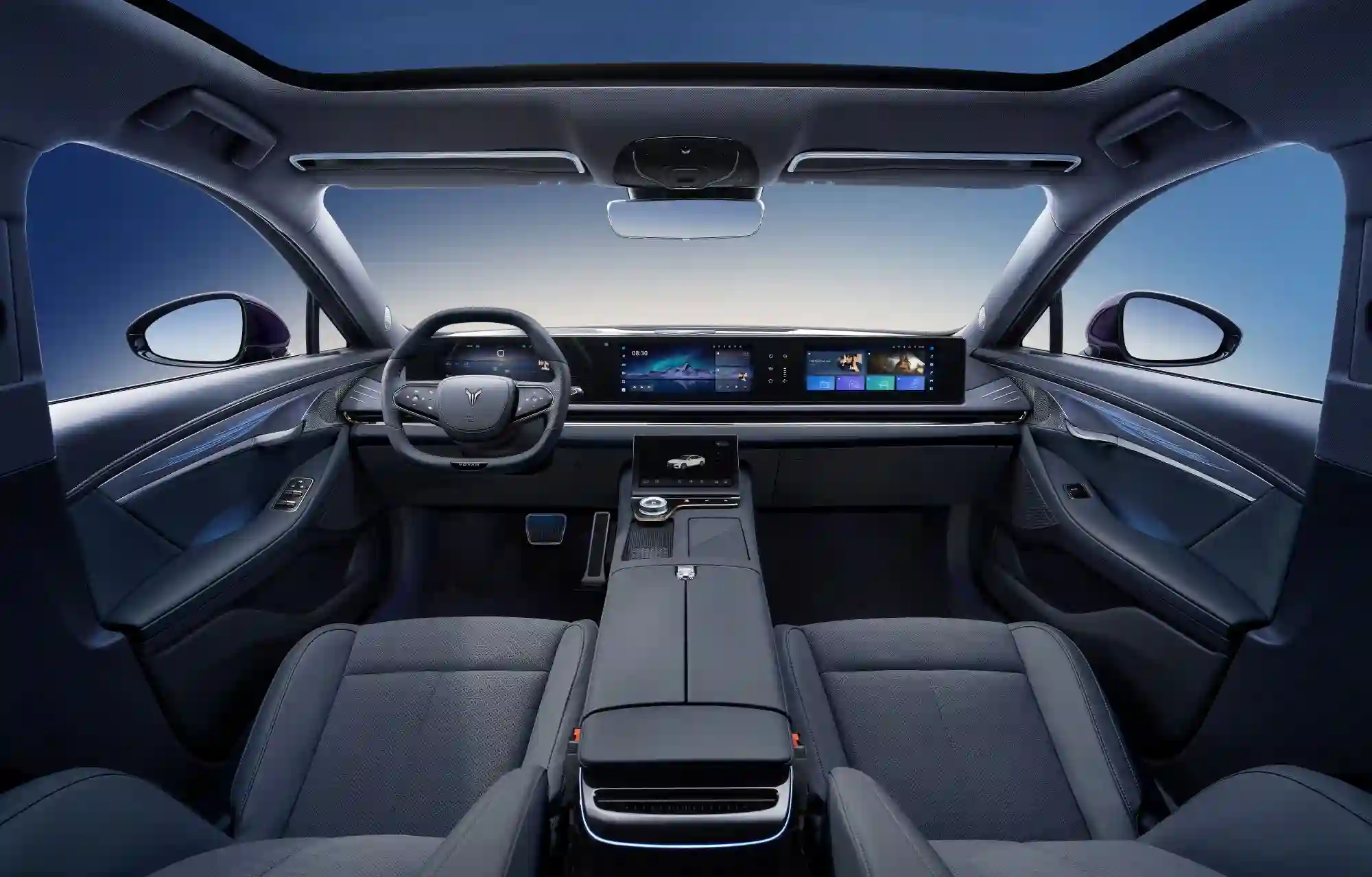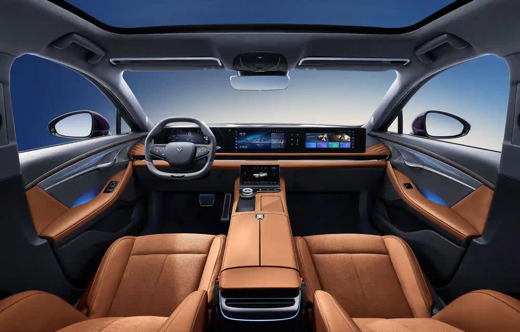 Салон VOYAH PASSION EVR доступен в двух цветовых комбинациях: черного с акцентными элементами серого и коричневого с акцентными элементами темно-серого оттенка.