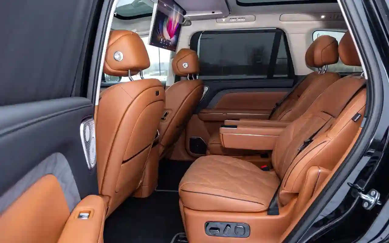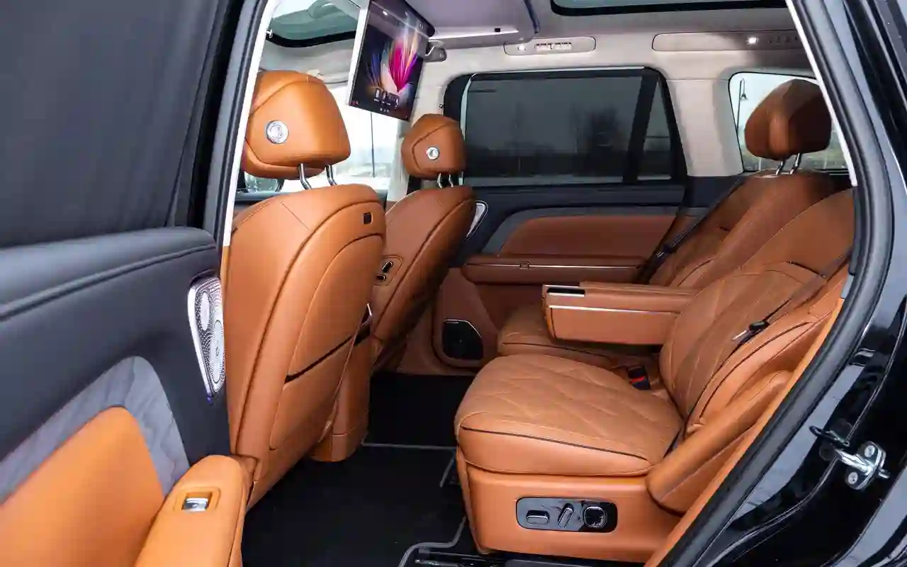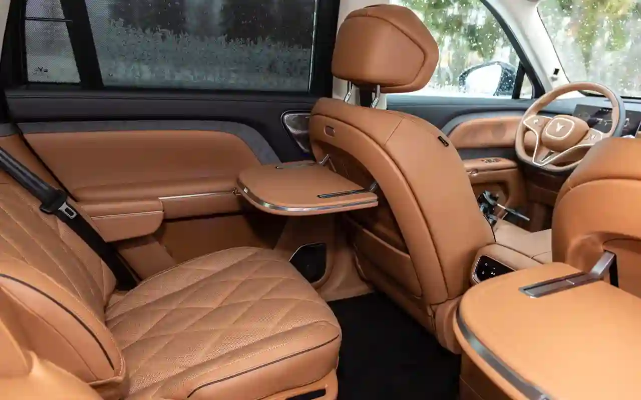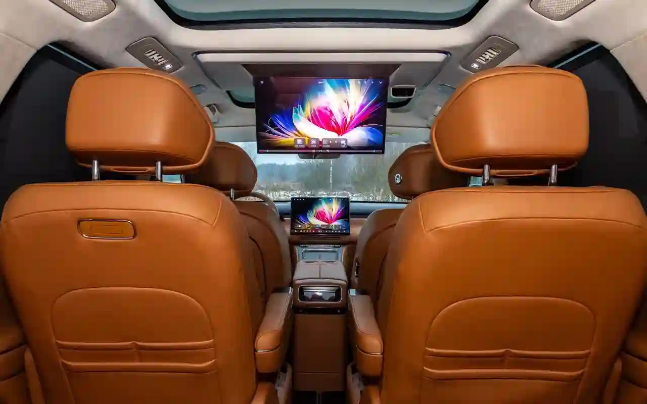 О банальных подогревах с вентиляциями говорить не имеет смысла. У каждого сиденья на втором ряду — отдельный 3,5-дюймовый цифровой пульт со всеми прибамбасами: хоть музыку включай, хоть караоке или видеоигру, либо же раскладывай в кровать, если захотелось вздремнуть. Откидной телевизор диагональю 21,4 дюйма на потолке, громадная панорамная крыша, электрические шторки на боковых окнах и столики в спинках передних кресел — все в VOYAH TAISHAN кричит о том, что пассажир здесь главный и машина только для него.
